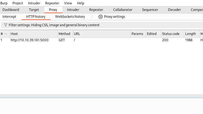 burbsuiteport then go tohttp://VM_IP:5555, then go back toburpsuiteand enter Proxy tab then HTTP history - you will see om GET request