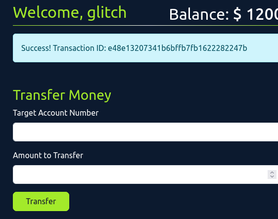 - to identify race condition we will login and send money transaction to get the POST request so lets login using the given credential and ACCOUNT NUMBER : 101 PASSWORD: glitch