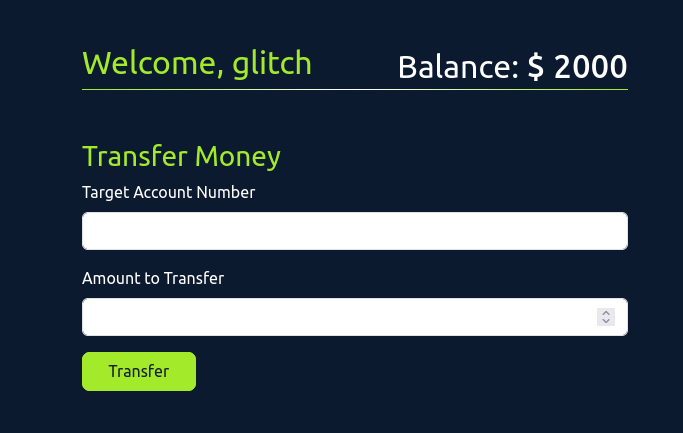 - to identify race condition we will login and send money transaction to get the POST request so lets login using the given credential and ACCOUNT NUMBER : 101 PASSWORD: glitch